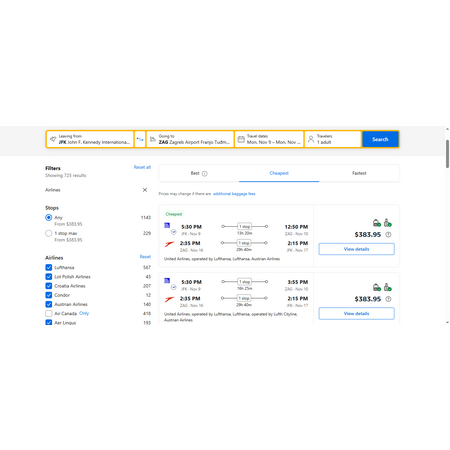 United Airlines and code-sharing partners such as Lufthansa, Austrian Airlines have round trip airfares travelling from New York (JFK) to Zagreb Croatia (ZAG) for $384, making 1 stop both ways. Stopover city & duration depends on the flight you choose which could range up to 20 hours in Vienna if your flight is operated by Austrian Airlines. These are basic economy fares that only allow a personal item and a carry-on bag. There is no seat selection and no change.
