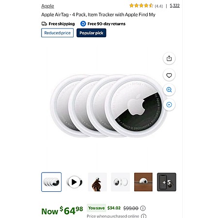 Apple AirTag - 4 Pack, Item Tracker with Apple Find My $64.98