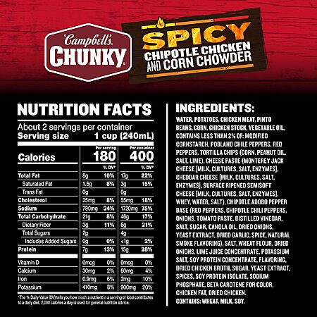 Model: Campbell’s Chunky Soup, Chipotle Chicken Corn Chowder Soup, 18.8 oz Can