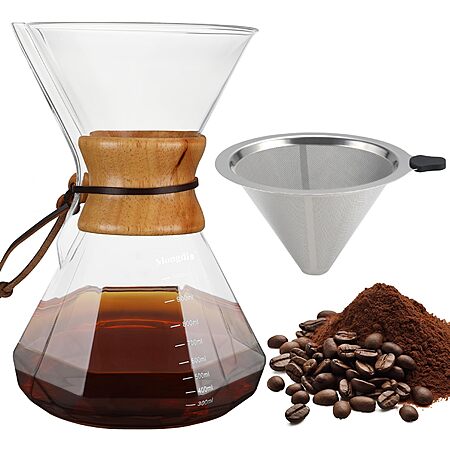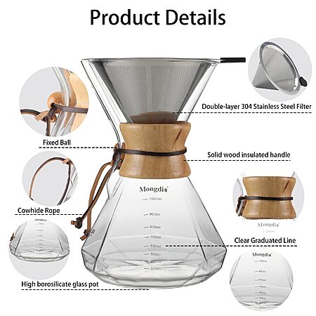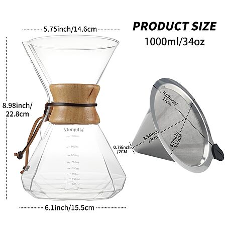 34-Oz Mongdio Borosilicate Glass Pour Over Coffee Maker w/ Reusable Stainless Steel Filter and Wooden Collar Holder $12.99 + Free Shipping w/ Prime or on $35+