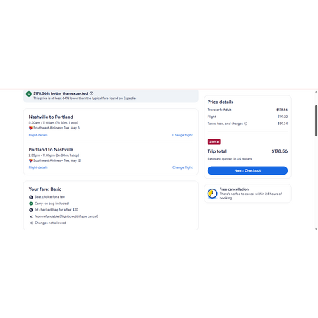 American Airlines. Southwest Airlines and Expedia have round trip airfares travelling to and from Portland OR (PDX) and Nashville TN (BNA) for $179, making 1 stop both ways. These are basic economy fares that allow a personal item and a carry-on bag. There is no seat selection and no change. If you are travelling with children on American, you will be seated together as per AA's policy.