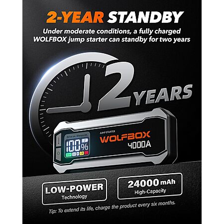 WOLFBOX 4000A 12V 24000mAh Portable Car Jump Starter w/ 65W Quick Charger