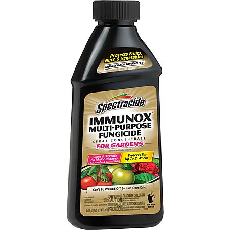 | Product Description: | The power is in your hands to keep your landscape in line – unleash it with Spectracide lawn and garden products. Our easy-to-use, fast-acting insect, lawn disease and weed control solutions help you tame lawn and landscape invaders with incredible pest-punishing power. Spectracide Immunox Multi-Purpose Fungicide Spray Concentrate for gardens cures and prevents all major diseases on roses, flowers, and ornamental shrubs. One treatment protects for up to 2 weeks. Once dry, this concentrate can’t be washed off by rain. Use it to control brown patch, powdery mildew, black spot, rust, blights, leaf spot, mold, scab, and more on ornamentals, lawns, trees, fruits, nuts, and vegetables as listed. This concentrated formula is highly effective when used to prevent diseases or when applied at the first sign of disease. Consider treating early in the season. Apply once every two weeks throughout the season until conditions favoring disease development (hot, humid weather) are no longer present. For fruits, nuts, berries, and vegetables, treat as directed on the label for your particular type. Mix with water in a garden sprayer (not included) at the rates directed on the label. Spectracide Immunox Multi-Purpose Fungicide for Gardens -fl oz Concentrated Fungicide | HG-51000 |