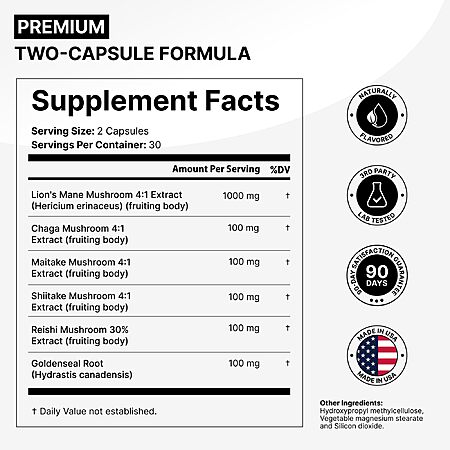 Model: Lions Mane Mushroom Complex - 5 in 1 Adaptogenic Blend - Lionsmane, Chaga, Maitake, Shiitake & Reishi Extract Capsules - Nootropic Mushroom Supplement for Memory, Focus & Immune Support