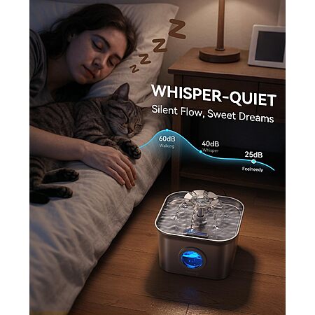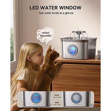 Stainless Steel Cat Water Fountain, 2.8L with 20dB Ultra-Quiet Pump- Ideal for Timid Pets, LED Water Level Window, Dishwasher Safe, 24/7 Circulation- Includes 3 Replacement Filters