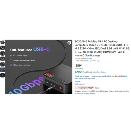【AMD RYZEN 7 7730U PROCESSOR】BOSGAME mini pc is equipped with AMD Ryzen 7 7730U processor (8C/16T, 16M Cache, up to 4.5GHz). Compared with AMD Ryzen 7(5700U/5825U), P4 Ultra MINI PC 7730U CPU performance +35%, more powerful performance and smoother running.