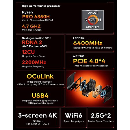 Oculink Port: Compared to traditional interfaces, OCuLink offers lower latency and higher stability, enabling seamless connection to external graphics cards (eGPUs) or high-speed storage devices. This allows Mini PCs to unleash expansion capabilities approaching those of desktop computers, making them ideal for high-load scenarios such as gaming, video editing, and 3D rendering.