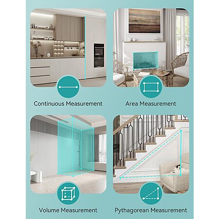 - Multiple Measurement Features: Area, distance, length, volume, continuous measurement, Pythagorean method (3 points), addition/subtraction, 20 data memory, low battery indication, auto shut-off after 150 seconds.