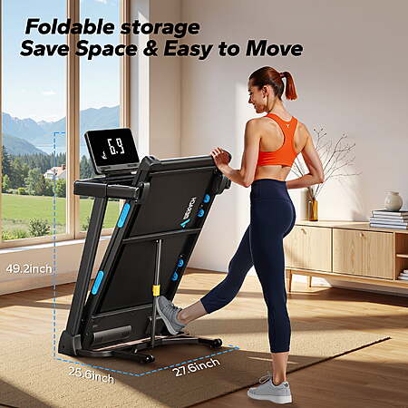 | Product Description: | MERACH 2.5HP Folding Treadmill with 6% Incline, Running Treadmill for Home with Bluetoothl, 0.8-7.5MPH, LED Display, APP The MERACH foldable treadmill offers a versatile, space-saving solution for home fitness. With 3 adjustable incline levels (0%, 3%, 6%) for enhanced fat burning, a 5-layer running belt with silicone shock absorbers for joint protection, and a spacious 41.3*16.5-inch running surface, it provides a smooth and effective workout. The treadmill folds easily into a compact size (4.84ft²), perfect for small spaces, and features bi-directional pulleys for effortless portability. Stay hydrated with two 4-inch cup holders, and track your performance via the LED display. Bluetooth connectivity lets you sync with the MERACH app for interactive workouts, virtual scenic routes, and expert fitness programs, all from the comfort of your home. Specifications: Input Power: 1000 Watts Deck Length: 41.3 Inches Deck Width: 16.5 Inches Maximum Incline Percentage: 6 Maximum Speed: 7.5 Miles per Hour Minimum Speed: 0.8 Miles per Hour Speed Rating: 7.5 miles_per_hour Maximum Horsepower: 2.5 Horsepower Maximum Weight Recommendation: 300 lbs Folded Size: 25.6 x 27.6 x 49.2 inches Note: Pre-use Check: Inspect the treadmill for any damage or loose parts. Ensure it's on a stable, flat surface, and put on proper athletic shoes. While Using: Start slow and gradually increase speed. Keep a steady pace and upright posture. Don't make sudden stops or starts. Post-use Care: Slow down gradually to a stop. Do some light stretching. Unplug the machine and store it safely. When receiving the goods, please confirm the product according to the listing of instructions. Once you find less pieces, please provide relevant pictures to contact us. We will deal it in the time. 3 Adjustable Incline Options: The treadmill with incline offers 3 adjustable levels (0%, 3%, 6%) to boost fat-burning potential. Elevate your workout intensity to burn more calories and achieve your fitness goals faster with this versatile home treadmill Space-Saving & Effortless Folding: Designed for compact living spaces, this foldable treadmill occupies just 4.84ft² when stored. It folds and unfolds in seconds, making it ideal for home use, and can be easily tucked away when not in use for ultimate convenience Smooth Ride with Comfort & Safety: With a 5-layer Running Belt and 6 Silicone Shock Absorbers, this treadmill ensures joint protection and a smooth, comfortable run. A Wide 41.3x16.5-inch Surface and a Maximum Speed of 7.5 MPH provide a great workout experience Portable & Built-In Cup Holders: Equipped with Pulleys, this treadmill is easy to move around your home. It also features TWO 4-inch Cup Holders to keep your drinks within easy reach, making it perfect for both walking and running workouts Smart Tracking & Interactive App: Monitor your performance with the LED Display showing Time, Speed, Calories, and Heart Rate. Control your workout via screen panel, and connect to the MERACH App via Bluetooth for Scenic Routes, Global Challenges, and Expert Fitness |