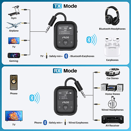 - Bluetooth transmitter(TX Mode) allows you via 3.5mm cable to transmits audio from TVs, PCs, airplane entertainment to Bluetooth headphones, earbuds, bluetooth speakers. Bluetooth Receiver(RX Mode) connected your smartphone to wired speakers/earphone through Bluetooth.