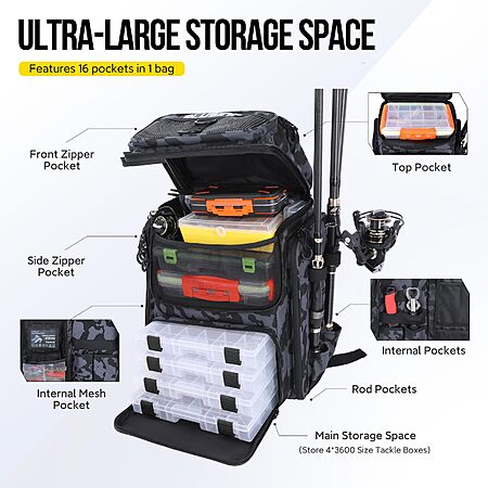 • Large Backpack with 16 Storage Pockets: 42L capacity with 16 pockets for organized storage of fishing rods, reels, tackle boxes, pliers, and more. Dimensions: 36.5 x 25.5 x 45.7 cm.