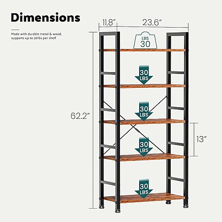 Details: - Strong & Sturdy Build with 30 lbs per Shelf - Engineered for strength and stability, each of the 5 shelves reliably holds up to 30 lbs. For added safety and peace of mind, we include an anti-tip wall mounting kit, ensuring the entire unit remains steadfast and wobble-free, even with heavy items.