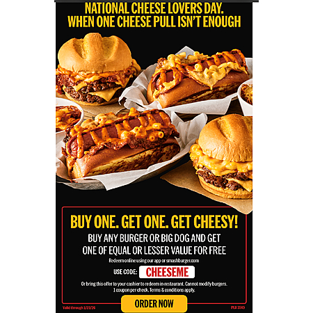 This new BOBO code (CHEESEME) works for online OR IN-STORE order, on ANY burger or dog, even their $4.99 burgers and dogs. ANY PROTEIN except crispy chicken! Can also show code to cashier in-store if you don't want to order online. Free burger is equal or less of the two obv. One coupon per check. No reason can't place multiple orders. Nice that no rewards account or app is required. But if you sign up for their rewards you'll get $5 off with $15 purchase. Note, the Ts and Cs in the link still show the BOGO code from last week, not the new code, but do have the new dates correct and I'm sure are the same. Valid till 1/23/26.