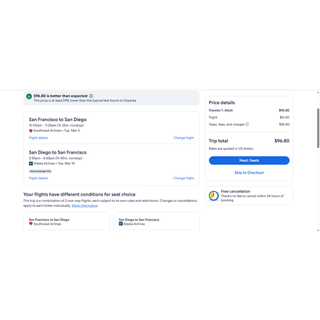 Alaska Airlines, Southwest Airlines, United Airlines and Expedia have round trip airfares travelling to and from San Diego (SAN) and San Francisco (SFO) for $97, nonstop. These are basic economy fares. On United you may have a personal item. On Southwest and Alaska, you may have a personal item and a carry-on bag. If you are travelling with children on United or Alaska, you will be seated together as per their policy.