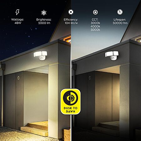 - ✔ DUSK TO DAWN - Built-in photocell sensor turns the ultra-bright 5000-lumen outdoor flood light on after sundown and off at dawn for ease of use, convenience, and energy savings.