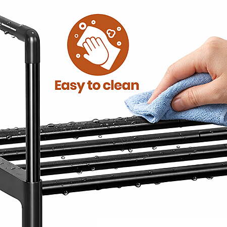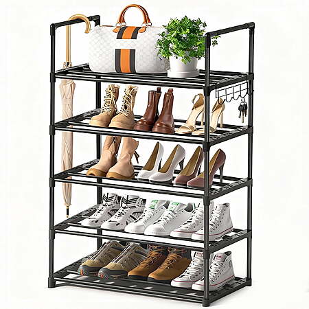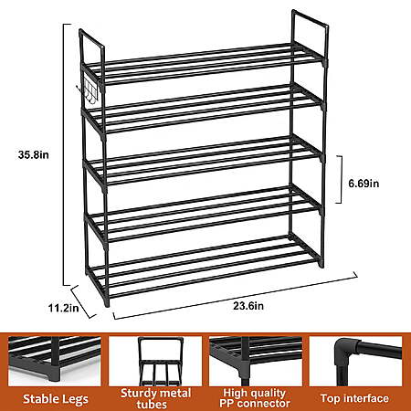 | Product Description: | Hadineeon's shoe rack combines high-quality plastic and metal to provide a strong, durable, and corrosion-resistant storage solution. Designed to withstand the weight of heavy shoes without bending or breaking, it surpasses other metal storage options in durability. Its compact, space-saving design makes it an excellent addition to any home, apartment, or dorm, allowing for a neat organization of not only footwear but also other items like bags, plants, and toiletries. Ease of assembly is guaranteed as no tools are required to set it up quickly. This multifunctional shoe rack, with its modern appearance and large storage capacity, serves as a stylish and practical way to keep your living space organized and clutter-free. Specifications: Color:Black Material:Stainless Steel, Plastic Product Size: 23.6"L x 11.2"W x 35.8"H 【5 Tiers Large Storage Space】 5 Tiers Shoe Rack has a large storage space design, The height can be freely assembled and changed according to the needs of the family to meet the storage needs of shoes of different heights, It can fit boots, High heels or slippers etc. 【Shoe Rack for Closet & Entryway】The shoe rack organizer can be placed in different places to organize your shoes, Such as: Closet, Garage, Corridor, Wardrobe, Cabinet, Dormitory, Patio, Entryway etc. 【Durable & Sturdy Structure】The shoe organizer is composed of thick and sturdy metal pipes and connectors. The sturdy and stable shoe shelf can withstand great weight without deformation or damage. The metal pipe adopts a black anti-rust coating process, which greatly enhances the service life, and can also be integrated with the decoration style of the room, Making the room comfortable and spacious. 【Easy to Assemble】Splice them together into new shoe racks at will, or create more units to hold all your family members' shoes and other items and keep them organized. Shoe racks that take up very little floor space are a great solution to keep your home and garage. |