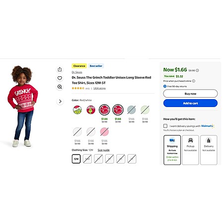 Dr. Seuss The Grinch Toddler Unisex Long Sleeve Red Tee Shirt $1.66