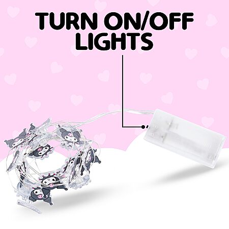 • KUROMI LIGHTS: Featuring cool white LED illumination accented with bold black, purple, and pink Kuromi icons, this 20-count 7-foot decorative light strand adds mischievous charm to bedrooms, dorms, offices, or any Hello Kitty and Friends–themed space.