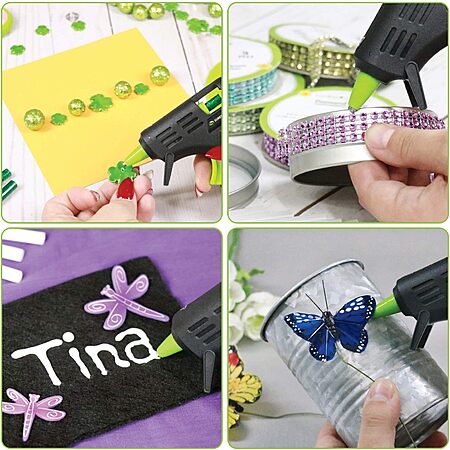 Mini high temperature glue guns are ideal for crafts, floral and do it yourself projects. Use high temperature for better bonding to metals, plastics and ceramic. Uses 4-Inch or 10-Inch glue sticks with 5/16-Inch diameter. Plug in cord for power and unplug immediately after use. Insert glue stick into the chamber, pull the trigger to advance glue. 10 watts, 120 volts.