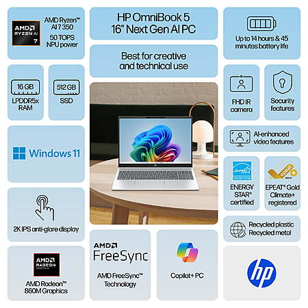 HP Omnibook 5 16 inch Windows Laptop AMD Ryzen 7 AI PC 16GB RAM 512GB SSD Glacier Silver $499