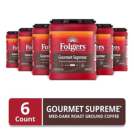 [S&S, AC] $17.79* | 6-Pack 9.6-Oz Folgers Medium Dark Roast Ground Coffee (Gourmet Supreme) at Amazon ($2.96 each)
