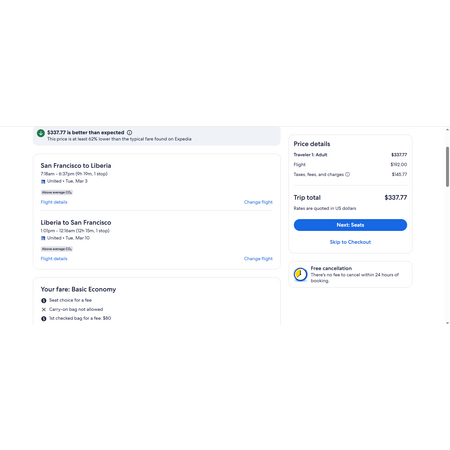 United Airlines, American Airlines and Expedia have round trip airfares travelling from San Francisco (SFO) to Liberia Costa Rica (LIR) for $338, making 1 stop both ways. Stopovers range from 2-6 hours depending on the flight you choose. These are basic economy fares. On American you may have a personal item and a carry-on bag. On United you may only have a personal item. There is no seat selection and no change. If you are travelling with children, you will be seated together as per each airline's policy.