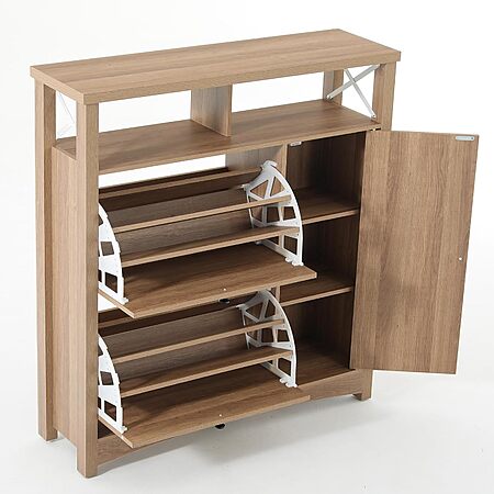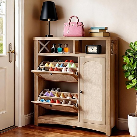 High-Capacity Storage: Features two flip-out drawers holding up to 18 pairs of shoes, a 3-tier side cabinet for boots, and open shelves for daily essentials.