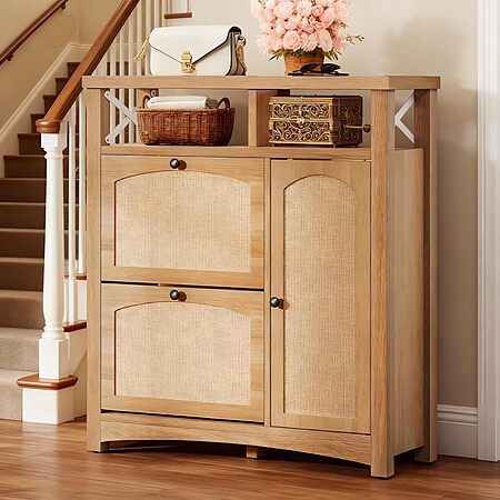 Model: YITAHOME Farmhouse Shoe Cabinet with 2 Flip Drawers, Rattan Shoe Rack w/Adjustable Shelves and Open Storage, Rustic Wood Entryway Organizer for Hallway, Foyer, Porch, Living Room, Light Oak