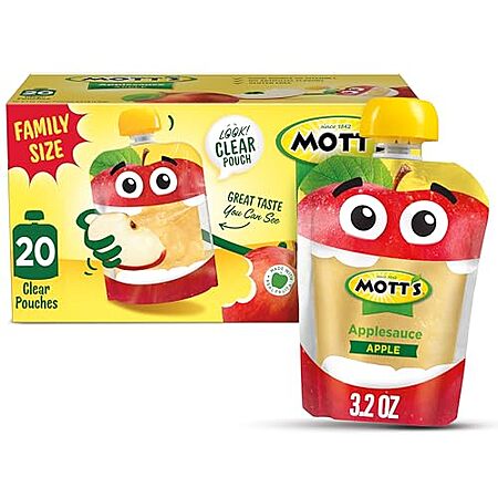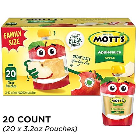 Amazon[amazon.com] has 20-Count 3.2-Oz Mott's Applesauce Pouches (Original Apple) for $8.45 - 25% when you 'clip' the coupon on product page - 5% when you check out via Subscribe & Save = $5.92. Shipping is free with Prime or on $35+ orders.