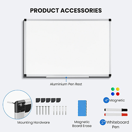 Includes mounting hardware, eraser, pen, and magnets