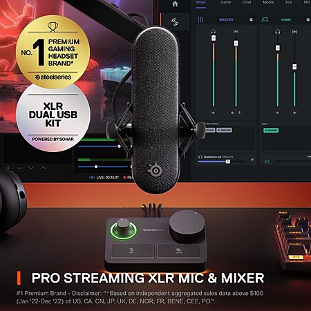 Amazon.com has SteelSeries Alias Pro Kit — XLR Mic + Stream Mixer — 3x Bigger Capsule for Gaming, Streaming and Podcasting — USB/XLR Interface — Free Sonar Audio Software — Custom Controls — RGB — Single or Dual PC on sale for $159.99. Shipping is Free.