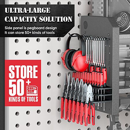 - Stores 50+ Tools: 3-tier organizer with 8 drill slots, 4 regular hooks, 8 S-hooks, and an attached toolbox for 30+ drill bits, 7 pliers, and 15 screwdrivers.