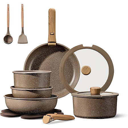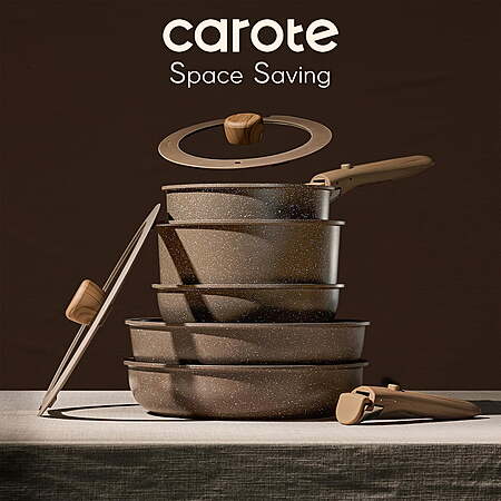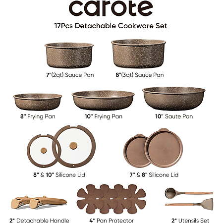 Carote Official via Walmart.com has CAROTE 17-Piece Nonstick Cookware Set with Detachable Handle, Induction Compatible, Oven Safe, Brown Pots and Pans for Kitchen & RV on sale for $59.99. Shipping is Free.