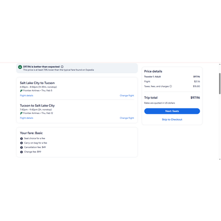 Frontier Airlines, an ultra low-cost, super basic economy airline and Expedia have airfares travelling to and from Salt Lake City (SLC) and Tucson AZ (TUS) for $98, nonstop. Your super low standard airfare will only take you and a personal item from point A to point B. There is no seat selection, no carry-on bag, no seat selection and no change. Slightly lower price if you have Discount Den membership.