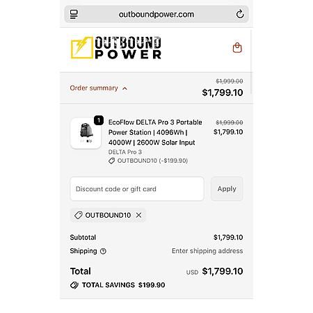 Outbound Power (Authorized EF Dealer) has Delta Pro 3 Portable power station on sale $1999 - use code OUTBOUND10 (10%) brings it down to $1799.10 (Free Shipping)