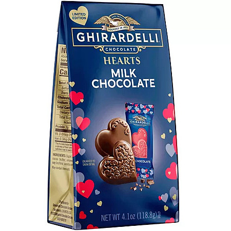 Celebrate the season of love with GHIRARDELLI Milk Chocolate Duet Hearts. Individually wrapped candy hearts are the perfect gifts for loved ones or that special someone. Each 4.1 ounce bag features sweet milk chocolate that makes for an indulgent Valentine's Day treat. The festive heart-shape candy is the perfect way to celebrate the season of love. These milk chocolate hearts are crafted with high-quality ingredients, including sustainably sourced cocoa beans, for a creamy, rich chocolate treat, and they're certified kosher. GHIRARDELLI Makes Life a Bite Better.