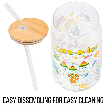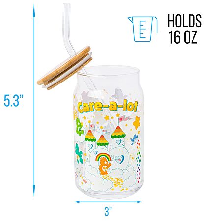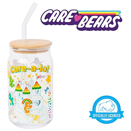 - STURDY GLASS TUMBLER: In this 16oz glass tumbler, it features all your favorite Care Bears at the magical land, Care-A-Lot! Join Friend Bear, Birthday Bear, Funshine, Grumpy Bear, Daydream Bear, Good Luck Bear, Wish Bear, Love-A-Lot Bear, Bedtime Bear, Tenderheart Bear, and Share Bear. PERFECT FOR EVERYDAY USE: Ideal for smoothies, iced coffee, tea, or any cold beverage, this tumbler keeps your drinks fresh while showing off your love for the Care Bears. Stay hydrated in style whether you're at home or on the go! ADDITIONAL FEATURES: The eco-friendly bamboo lid fits snugly to prevent spills, while the reusable glass straw makes this tumbler a sustainable option for fans who want to reduce plastic waste. It's a cute and functional way to enjoy your drinks. OFFICIAL MERCHANDISE: Official Care Bears merchandise. Relive the magic of Care-A-Lot with every sip, and show off your love for Tenderheart Bear, Cheer Bear, and all their friends from the clouds of Care-A-Lot. CARE INSTRUCTIONS: Hand-wash only to preserve the glass tumbler and bamboo lid. Avoid extreme temperatures and do not microwave. Glass straw should also be hand-washed for best results.