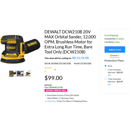 DEWALT DCW210B 20V MAX Orbital Sander, 12,000 OPM, Brushless Motor for Extra Long Run Time, Bare Tool Only (DCW210B). Free Shipping. $99