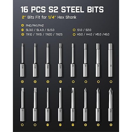 • 16-in-1 Metal Bits: Includes 16 S2 steel bits in 5 categories, perfect for a variety of maintenance tasks.