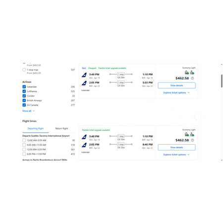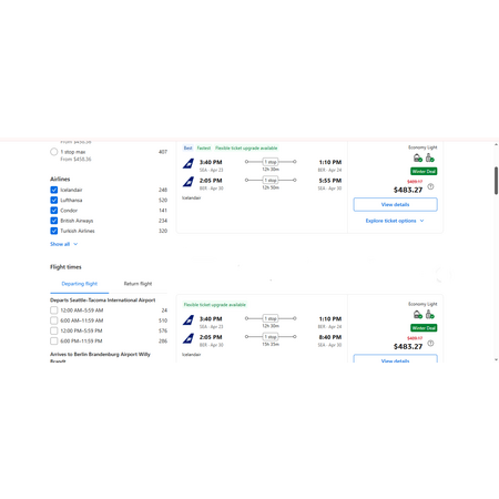Icelandair via Booking.com have round trip airfares travelling from Seattle (SEA) to Berlin Germany (BER) for $463-$484, making 1 stop in Iceland for a couple of hours, both ways. These are basic economy fares that allow a personal item and a carry-on bag. There is no seat selection and no change.