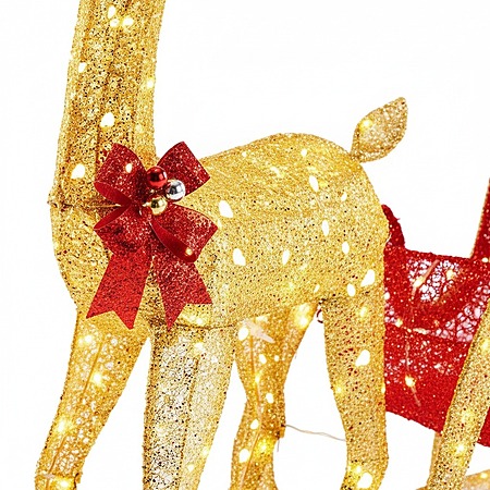 Model: MCQ 4ft Lighted Reindeer with Sleigh, 180 LED Outdoor Christmas Yard Decoration for Holiday, Red Gold
