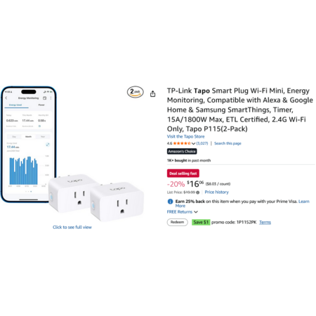 Amazon Prime Members: TP-Link 𝗧𝗮𝗽𝗼 Energy Monitoring Smart Plug Wi-Fi Mini, Tapo P115 (2-Pack). YMMV - Final Cost After Promo Code and Cash Back $11.30