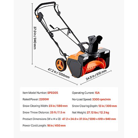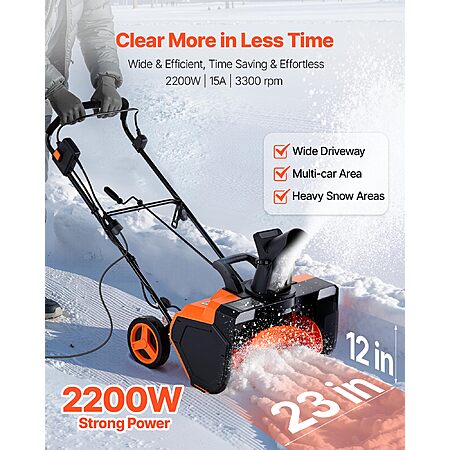 Amazon.com has VEVOR Electric Snow Blower, 23 inch 15A Corded Snow Thrower with Dual LED Headlights & 180° Rotating Chute, 25FT Throwing Distance, 12" Depth Clearing, Walk-Behind Snowblower for Driveway Sidewalk on sale for $109.99. Shipping is Free.
