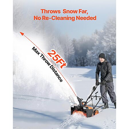 - 25FT Snow Throwing Distance: The electric snow blower throws snow up to 25 ft / 7.5 m away, offering an extended clearing radius to cover large areas with fewer adjustments.