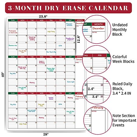 - 28"x40" Oversized Calendar: 3 undated monthly grids with note sections for flexible year-round planning.