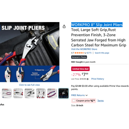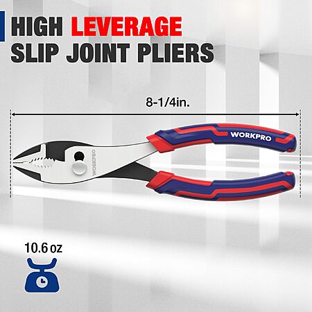 WORKPRO 8” Slip Joint Pliers Tool, Large Soft Grip, Rust Prevention Finish, 3-Zone Serrated Jaw, Forged from High Carbon Steel. YMMV - Coupon Price $6.79