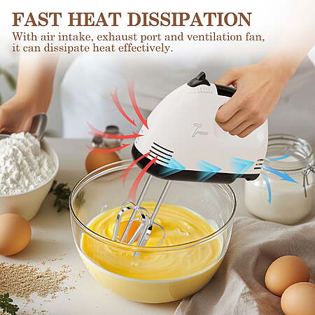 TINANA hand mixer electric handheld includes 4 stainless steel attachments (2 beaters + 2 dough hooks) for whipping cream, kneading dough, and other baking tasks. Our kitchen electric mixer weighs just 1.3 lbs with an ergonomic handle for easy one-handed use. The cake mixer for baking features 7-speed control + turbo boost to easily handle tough ingredients like frozen butter. One-touch release for mess-free attachment changes. Heat dissipation design. Dishwasher-safe parts for effortless cleanup. Handheld Mixer Kits: This kitchen mixer comes with 4 stainless steel attachments (2 beaters + 2 dough hooks) to effortlessly handle various baking tasks like whipping cream, kneading dough, and beating eggs. Perfect for creating fluffy cake batters or elastic pizza dough, our hand mixer is specially designed for baking enthusiasts. Lightweight & Streamlined Design: Weighing only 1.3 lbs, this electric hand mixer features a streamlined, ergonomic handle for comfortable one-handed operation. Its standing base design keeps the mixer stable on the countertop while keeping beaters or dough hooks elevated to prevent mess. Premium Performance: Built to last, this powerful electric mixer handles all mixing tasks with ease. The dishwasher safe stainless steel attachments save time on cleanup. Advanced heat dissipation technology prevents overheating during prolonged use and extends the small hand mixer's lifespan. One Touch Eject Button: One touch release, no messy hands, effortlessly swap mixing accessories. The eject button of baking mixer only works when the speed dial is reset to zero, preventing accidental detachment during operation - safe for users of all ages. 7 Speed & Turbo Boost: Easily adjust speeds with the intuitive button control, offering 7 precision settings from low to high, handling everything from baby food prep to professional baking. The upgraded handheld mixer 5520 turbo acceleration motor delivers 30% more power for tough ingredients like frozen butter. Note: Start at low speed and gradually increase to prevent splattering.