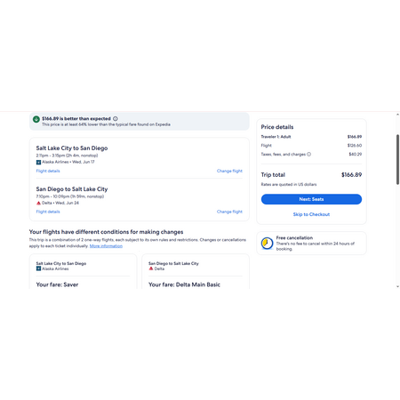 Delta, Alaska and Expedia have round trip airfares travelling to and from Salt Lake City (SLC) and San Diego (SAN) for $167, nonstop These are basic economy fares, a restricted-type fare. You may have a personal item and a carry-on bag. There is no seat selection and no change. If you are travelling with children on Alaska, you will be seated together as per their policy. Delta decides that on a case-by-case basis.