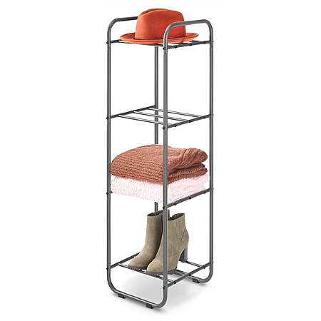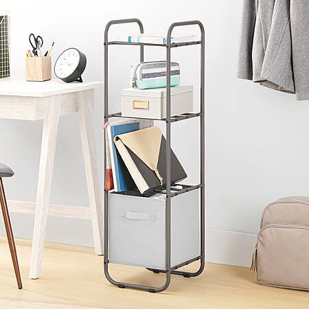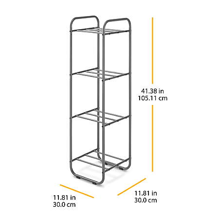 | Product Description: | Whitmor 's 4-Tier Vertical Shelf Organizer is the perfect way to utilize vertical space for storage. With a modern design featuring curved edges, this shelf organizer is great for the living room, bathroom, office, garage, entryway, or bedroom. Store books, music records, shoes & accessories, or bathroom supplies using the 4 shelves. Shelves can accommodate 11 inch fabric cubes to conceal the items being stored. Built with a durable steel frame and easy assembly, this shelf is functional for any space. Utilize your vertical space to store clothing, shoes, accessories, books, etc. Perfect for extra storage in an entrway, bedroom, bathroom, closet, or pantry Can accommodate 11 inch fabric storage cubes to keep items contained Assembled Dimensions: 11.81 L x 11.81 W x 41.38 H inches Easy assembly with tools included |