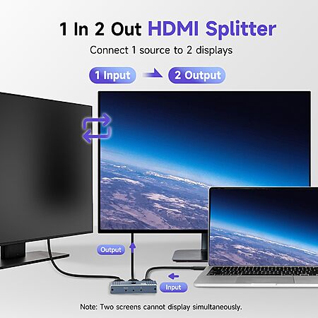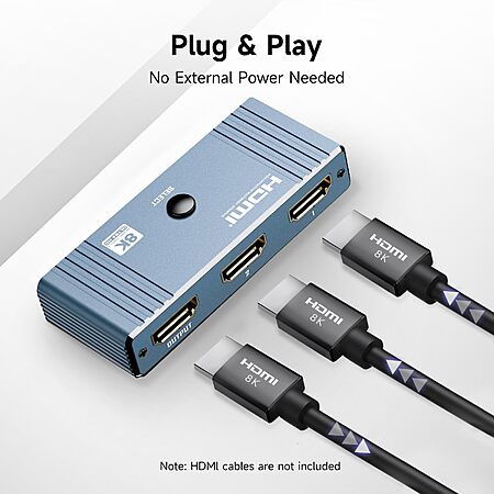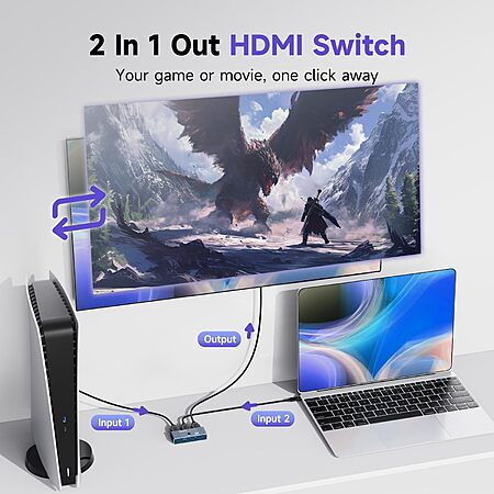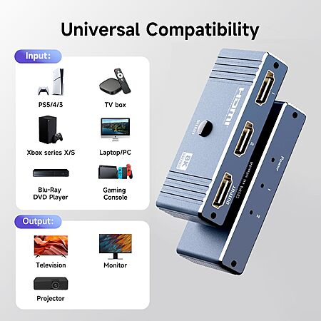 HDMI Switch 8K 60Hz - HDMI 2.1 Switcher 2 in 1 Out, 4K@120Hz Aluminum HDMI 2.1 Splitter, Manual Switch Compatible with PS5/4/3 Xbox Fire Stick Blu-Ray (Multicolors) $9.99